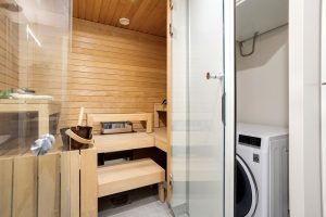 +Lasiseinällä rajattu tunnelmallinen OMA SAUNA kutsuu rentouttaviin löylyihin vastakkain istuttavile lauteille.